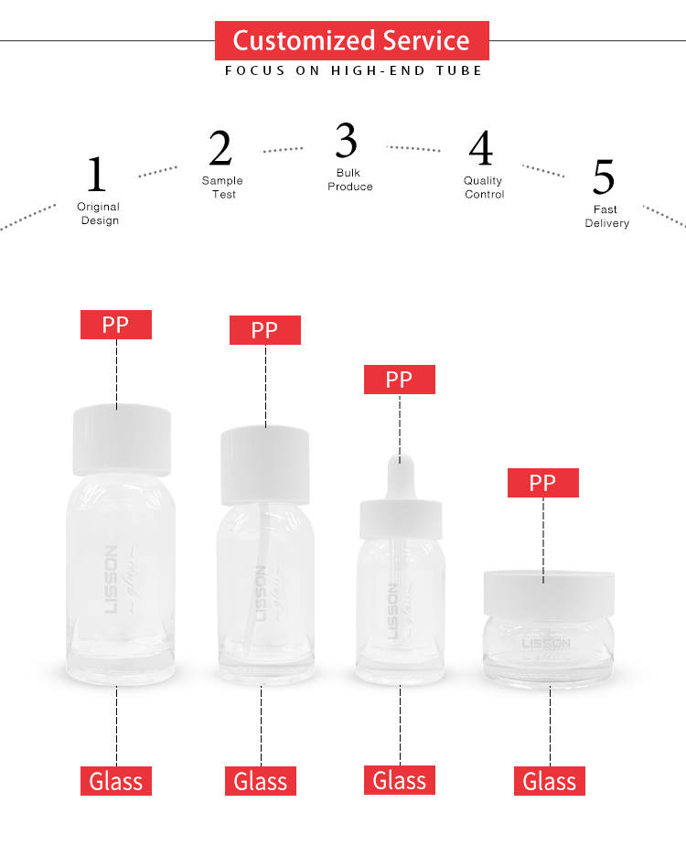 Offset, silkscreem, hot stampingFrasco de vidro transparente de luxo para embalagens de produtos de cuidados com a pele. Mostre, não esconda — uma embalagem que deixa sua fórmula brilhar.